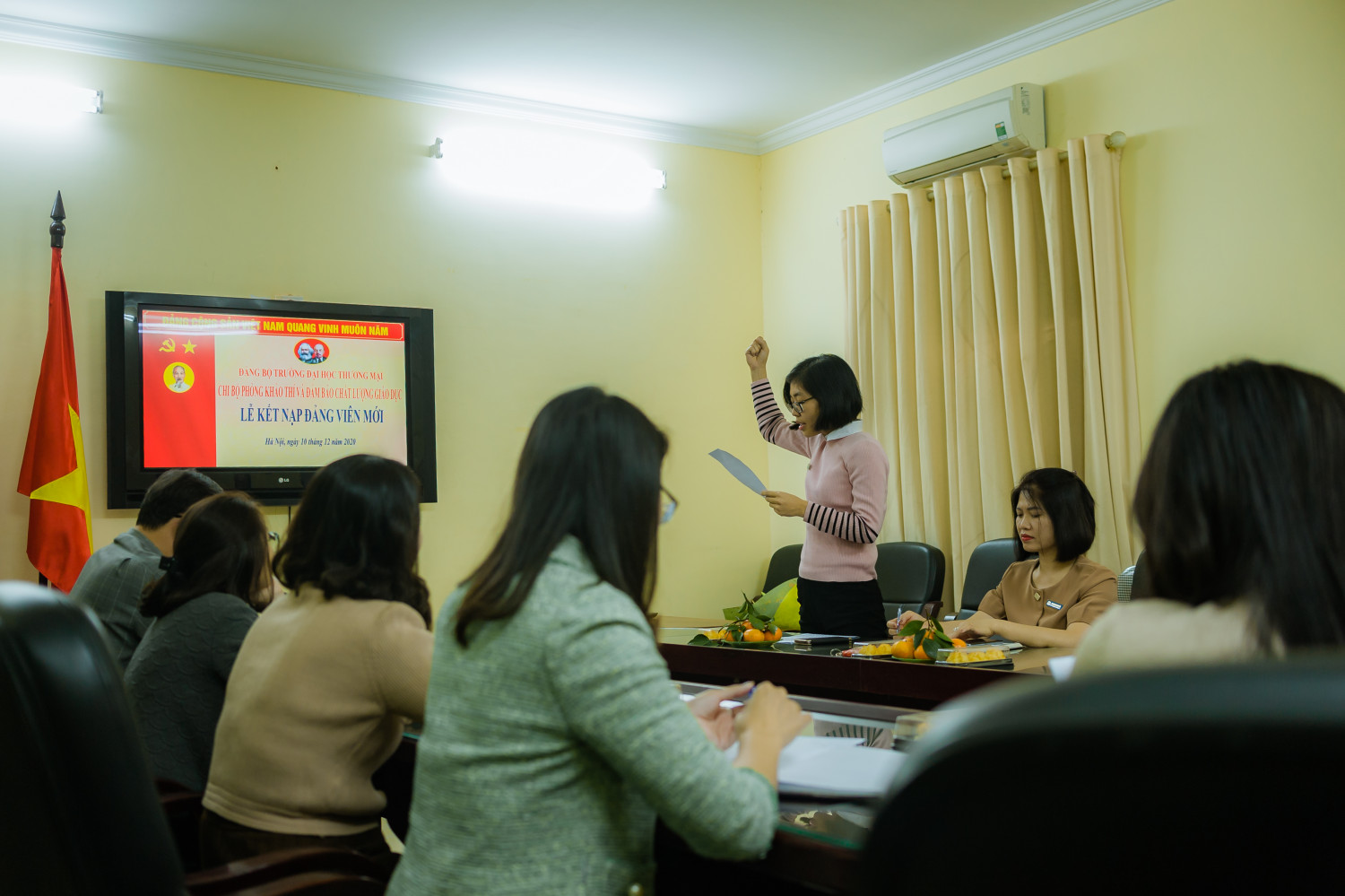 Căn cứ Quyết định kết nạp đảng viên số 29-QĐ/ĐU ngày 12/11/2020 của Đảng ủy trường Đại học Thương mại, chiều ngày 10/12/2020, Chi bộ phòng Khảo thí và Đảm bảo chất lượng giáo dục đã tổ chức Lễ kết nạp đảng viên mới đối với quần chúng ưu tú Nguyễn Thị Thu Hương với sự tham dự của toàn bộ đảng viên trong chi bộ.