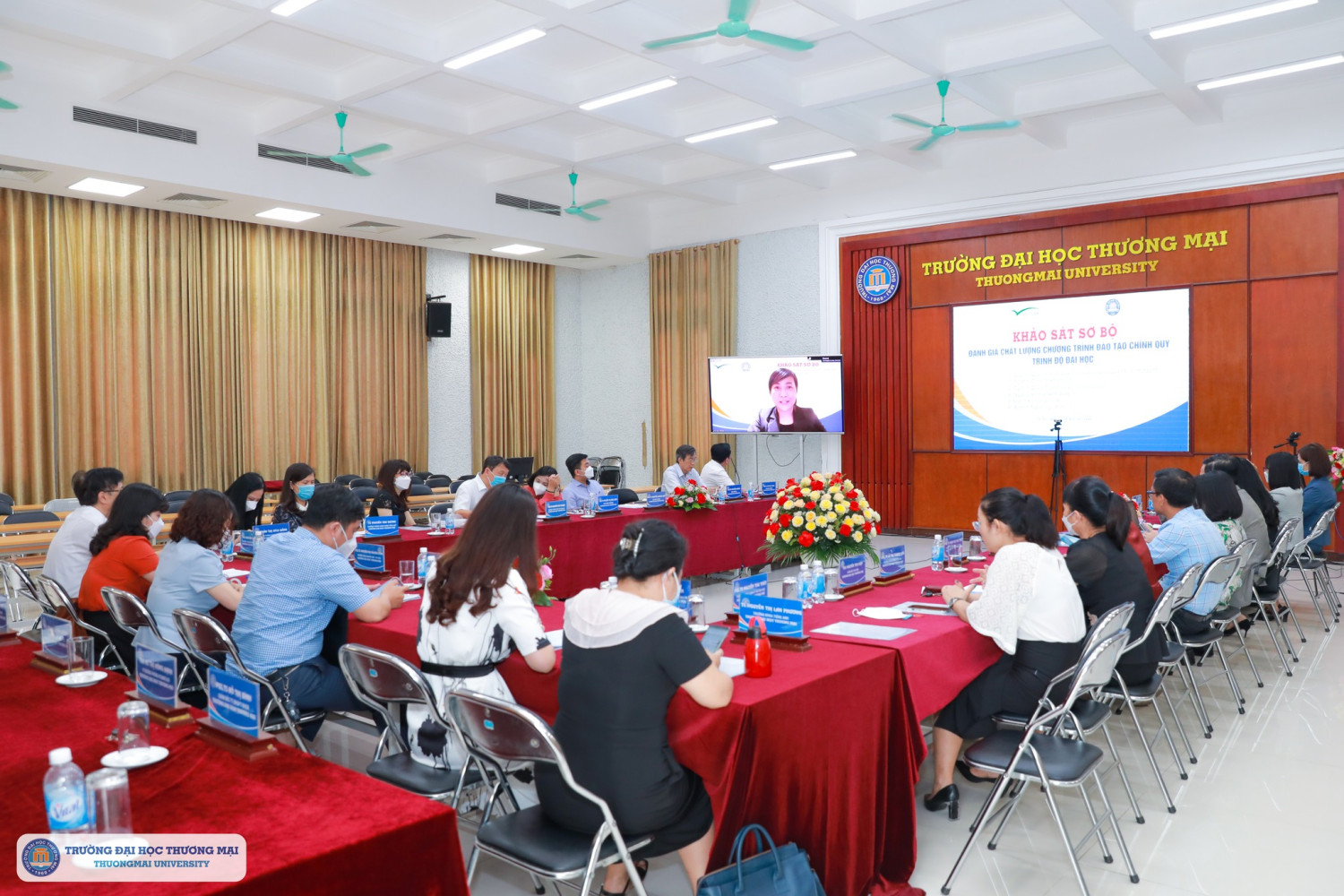 Tham dự theo hình thức trực tuyến về phía Đoàn đánh giá ngoài của Trung tâm Kiểm định chất lượng giáo dục – Đại học Quốc gia Hà Nội có TS, Tạ Thị Thu Hiền - Giám đốc trung tâm Kiểm định chất lượng giáo dục – Đại học Quốc gia Hà Nội; GS, TS Nguyễn Hữu Đức – Trưởng đoàn đánh giá ngoài. Về phía Trường Đại học Thương mại có PGS, TS Bùi Hữu Đức – Bí thư Đảng ủy, Chủ tịch HĐT; các thành viên Hội đồng TĐG, nhóm chuyên trách và ban thư ký TĐG các CTĐT, Trưởng một số phòng ban và cơ sở Hà Nam.