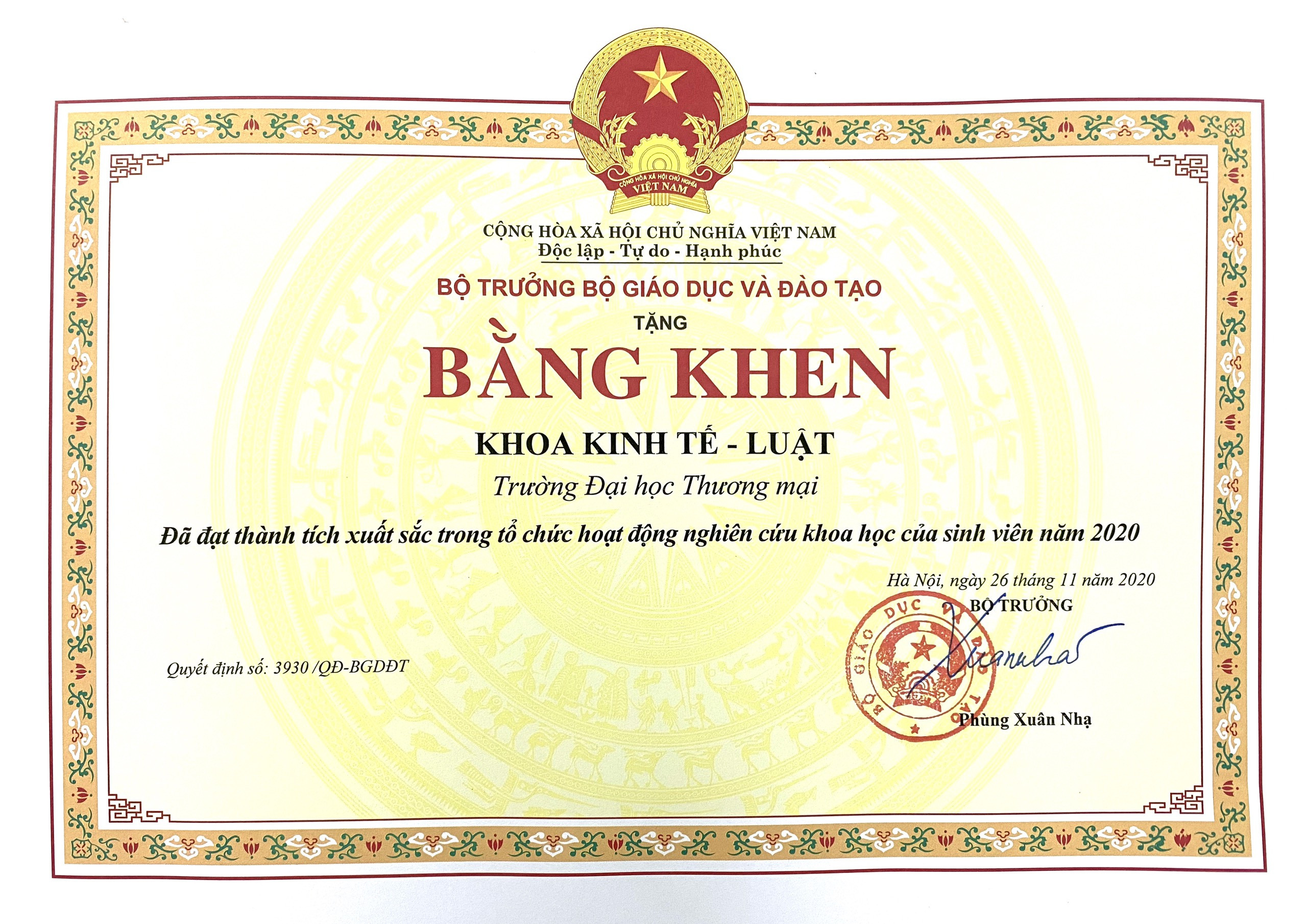 Năm 2020 Khoa Kinh tế - Luật vinh dự nhận Bằng khen của Bộ trưởng Bộ Giáo dục và đào tạo vì đã có thành tích xuất sắc trong tổ chức hoạt động nghiên cứu khoa học của sinh viên.