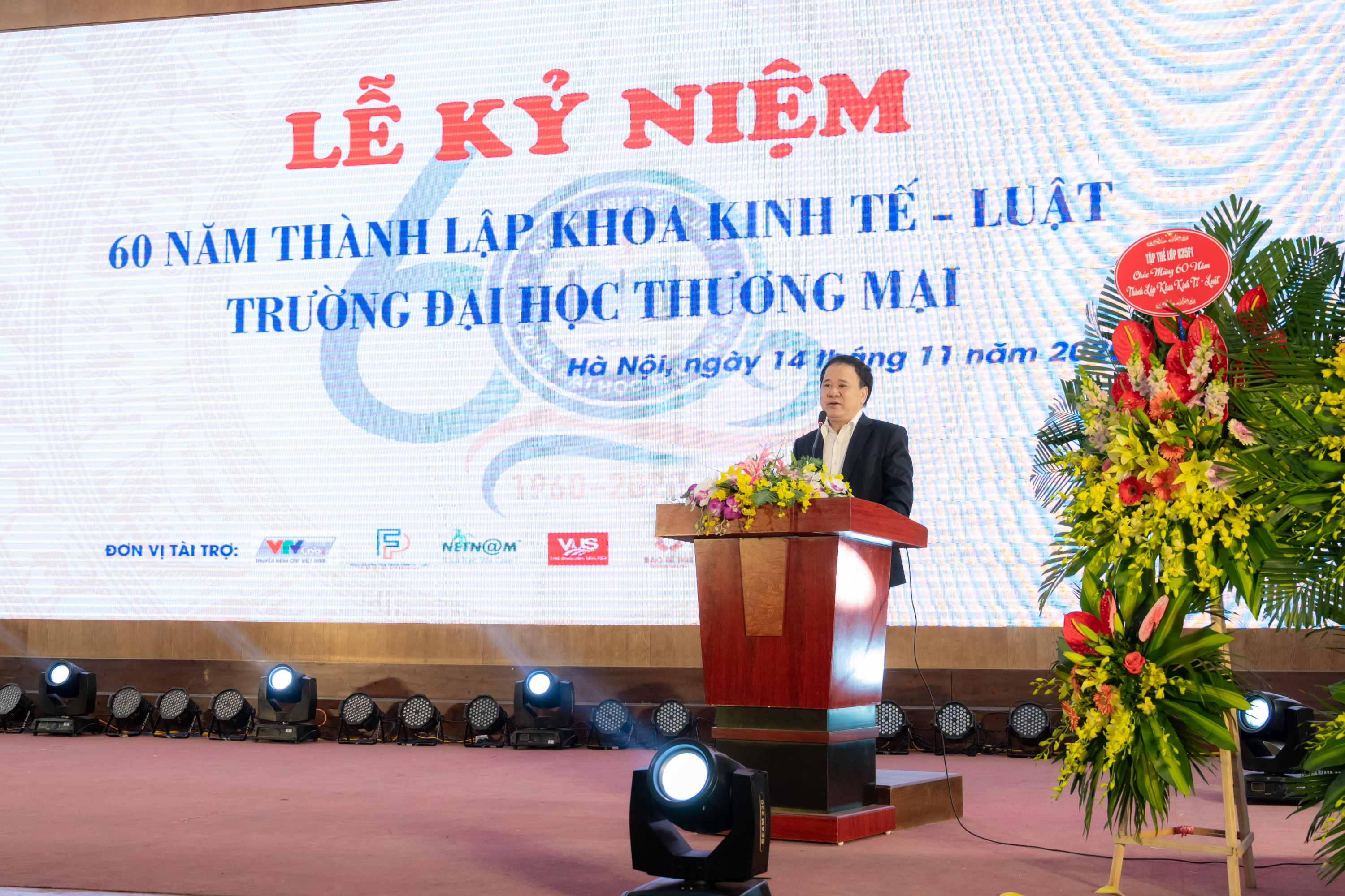 Những thành tích ấn tượng và đóng góp quan trọng của khoa vào sự phát triển chung của trường Đại học Thương mại đã một lần nữa được khẳng định thông qua lời phát biểu chúc mừng của GS,TS. Đinh Văn Sơn – Hiệu trưởng Nhà trường. GS,TS. Đinh Văn Sơn cũng nhắn nhủ thầy và trò của khoa Kinh tế - Luật: “Hành trình 60 năm xây dựng và phát triển – là một chặng đường dài được nuôi dưỡng, vun đắp bằng nhiệt huyết, ước mơ, những khát vọng, hoài bão và sự nỗ lực phấn đấu của các thế hệ giáo viên, sinh viên khoa Kinh tế - Luật. Xin chúc Khoa Kinh tế - Luật từ sau cột mốc kỷ niệm 60 năm thành lập này càng thêm vững vàng, bản lĩnh và trí tuệ, để tiếp tục bay cao, bay xa hơn nữa; tiếp tục khẳng định và phát huy những giá trị đã được tạo dựng và xác lập; nâng cao vị thế vững chắc, lan tỏa uy tín của Khoa trong lĩnh vực đào tạo và NCKH ở Việt Nam…”.