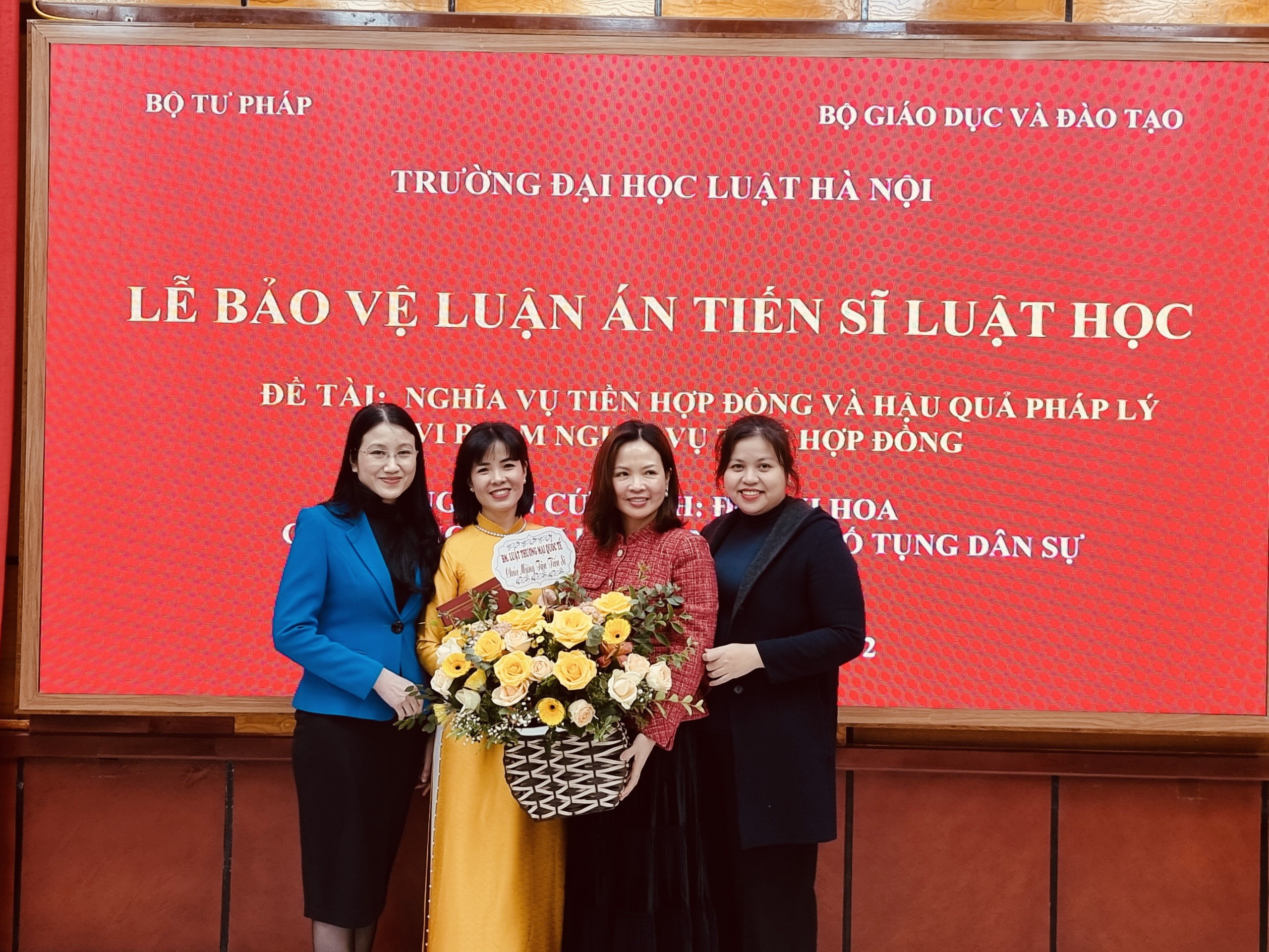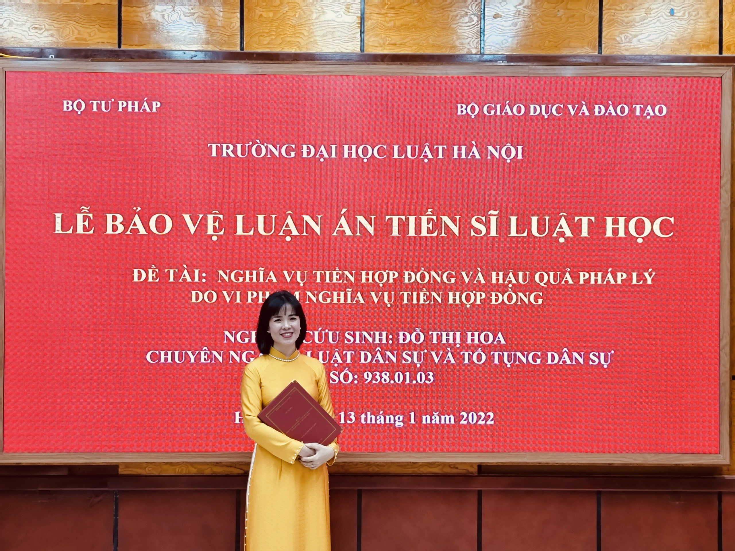 Ngày 13/01/2022, tại Trường Đại học Luật Hà Nội đã tổ chức Lễ bảo vệ Luận án tiến sĩ khoa học cấp trường cho nghiên cứu sinh (NCS) Đỗ Thị Hoa, Chuyên ngành: Luật Dân sự và Tố tụng dân sự. Mã số: 9 38 01 03 với Đề tài luận án: “Nghĩa vụ tiền hợp đồng và hậu quả pháp lý do vi phạm nghĩa vụ tiền hợp đồng”. Hội đồng khoa học cấp trường đã thông qua lý lịch khoa học, thành tích nghiên cứu, quá trình học tập và kết quả nghiên cứu khoa học của NCS Đỗ Thị Hoa. NCS Đỗ Thị Hoa trình bày tóm tắt nội dung luận án tiến sĩ. Luận án đã xây dựng được hệ thống lý luận khoa học về nghĩa vụ tiền hợp đồng và hậu quả pháp lý do vi phạm nghĩa vụ tiền hợp đồng. Luận án đã phân tích sắc nét về hệ thống thực trạng các quy định về nghĩa vụ tiền hợp đồng và hậu quả pháp lý do vi phạm nghĩa vụ tiền hợp đồng. Từ đó, Luận án đưa ra một số giải pháp nhất định góp phần hoàn thiện các quy định của pháp luật dân sự Việt Nam về nghĩa vụ tiền hợp đồng và hậu quả pháp lý do vi phạm nghĩa vụ tiền hợp đồng. Đánh giá kết quả đạt được của Luận án, Hội đồng đánh giá luận án: đánh giá cao năng lực nghiên cứu và những kết quả đạt được của NCS trong thời gian qua. Luận án là công trình khoa học nghiên cứu toàn diện cơ sở lý luận, pháp luật và thực tiễn về nghĩa vụ tiền hợp đồng và hậu quả pháp lý do vi phạm nghĩa vụ tiền hợp đồng. Luận án được các thành viên Hội đồng nhất trí thông qua. Xin chúc mừng cô giáo, NCS Đỗ Thị Hoa, chúc mừng khoa Kinh tế - Luật đã có thêm một tân Tiến sĩ. Dưới đây là một vài hình ảnh của buổi bảo vệ luận án.