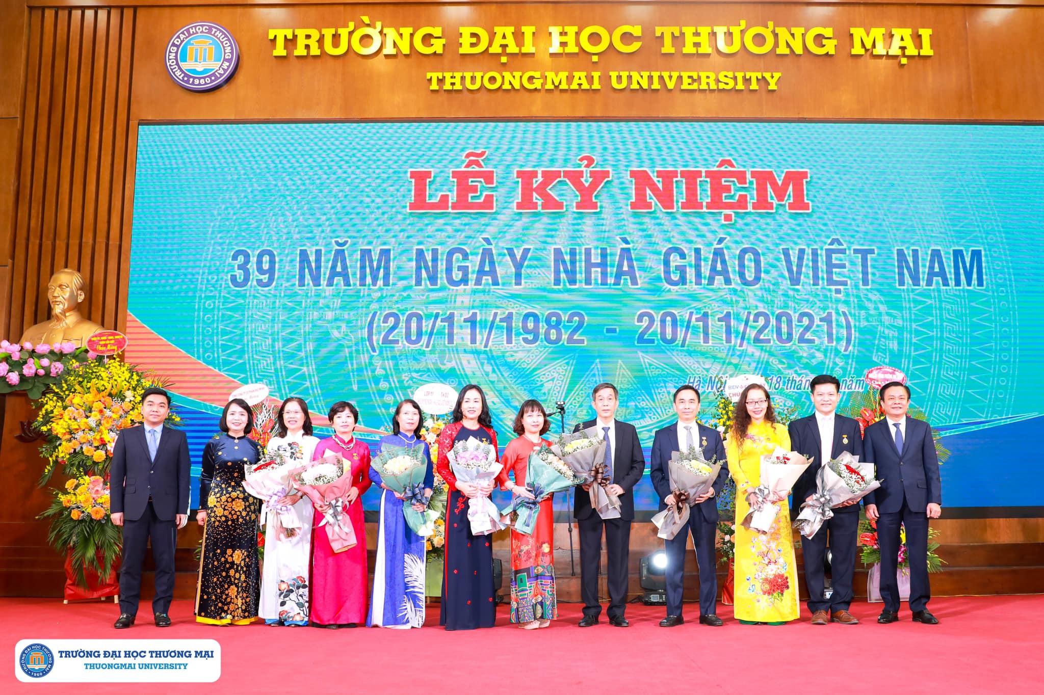 Tại buổi lễ này Trường Đại học Thương mại đã vinh danh 01 nhà giáo được phong tặng danh hiệu Nhà giáo nhân dân: GS.TS Đinh Văn Sơn cùng 8 Nhà giáo được phong tặng danh hiệu Nhà giáo ưu tú lần thứ 15 và tuyên dương các nhà giáo, cán bộ quản lý tiêu biểu năm 2021 được tổ chức tại Trung tâm Hội nghị 37 Hùng Vương ngày 14/11/2021 vừa qua.