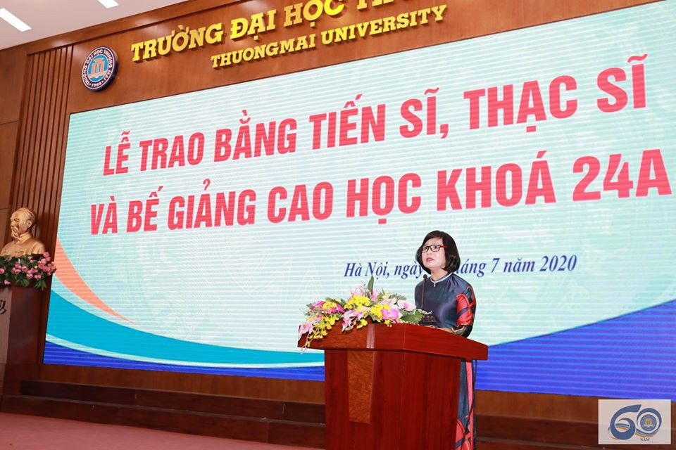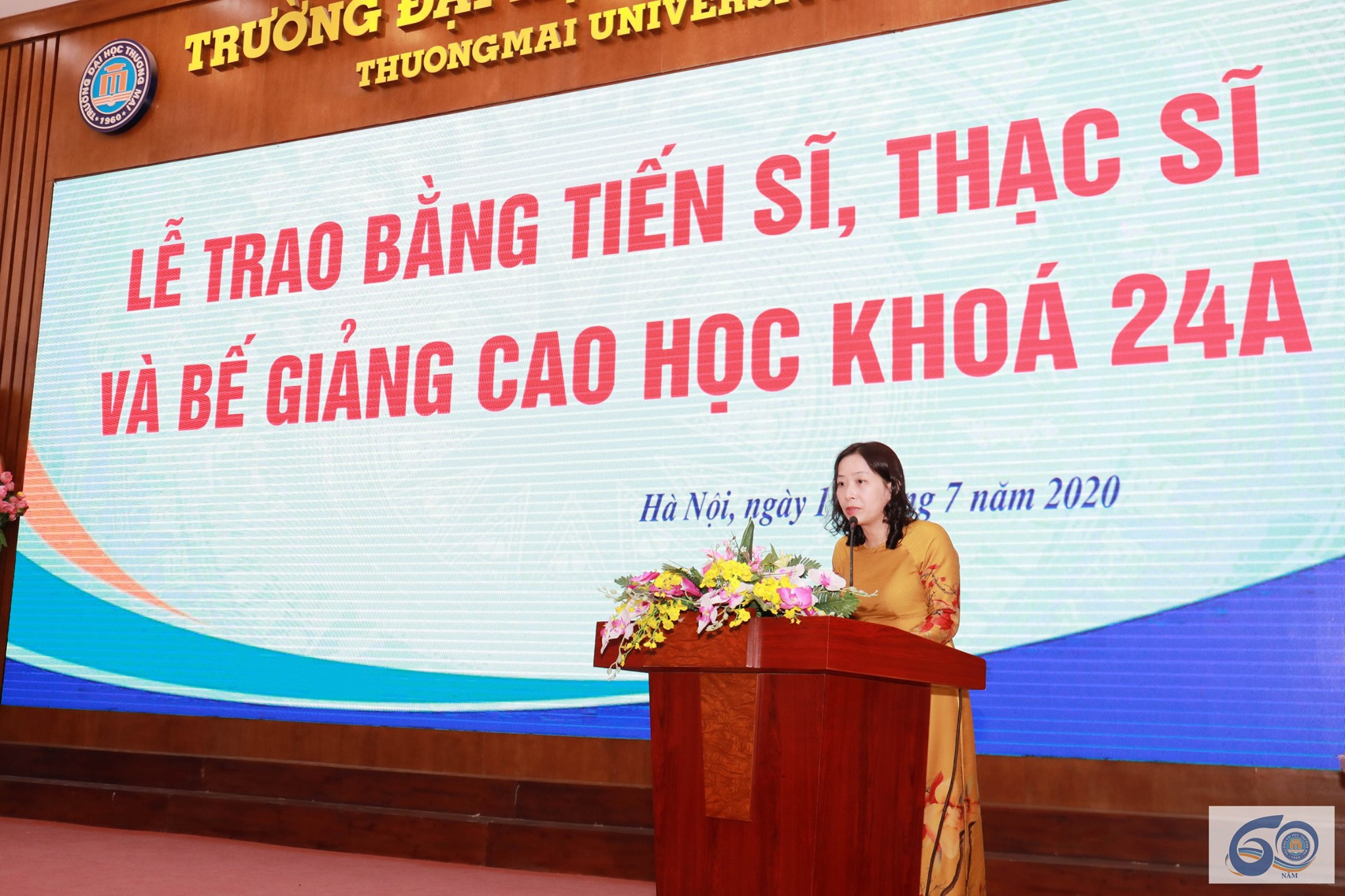 Thay mặt lãnh đạo Nhà trường, PGS.TS Nguyễn Thị Bích Loan – Phó hiệu trưởng Nhà trường chúc mừng các học viên cao học, nghiên cứu sinh đã hoàn thành khóa đào tạo, biểu dương và ghi nhận sự cố gắng, nỗ lực của các học viên cao học, nghiên cứu sinh đã khắc phục mọi khó khăn, hoàn thành tốt chương trình đào tạo và chính thức trở thành những Tiến sĩ, Thạc sĩ của Trường Đại học Thương mại, góp phần vào việc thực hiện thắng lợi mục tiêu, nhiệm vụ của Nhà trường cũng như khẳng định uy tín, chất lượng đào tạo của Trường Đại học Thương mại. PGS.TS Nguyễn Thị Bích Loan tin tưởng với những kiến thức đã tiếp thu tại Nhà trường, các tân Tiến sĩ, tân Thạc sĩ sẽ áp dụng tốt vào trong quá trình công tác, góp phần xây dựng đất nước ngày càng phát triển vững mạnh.