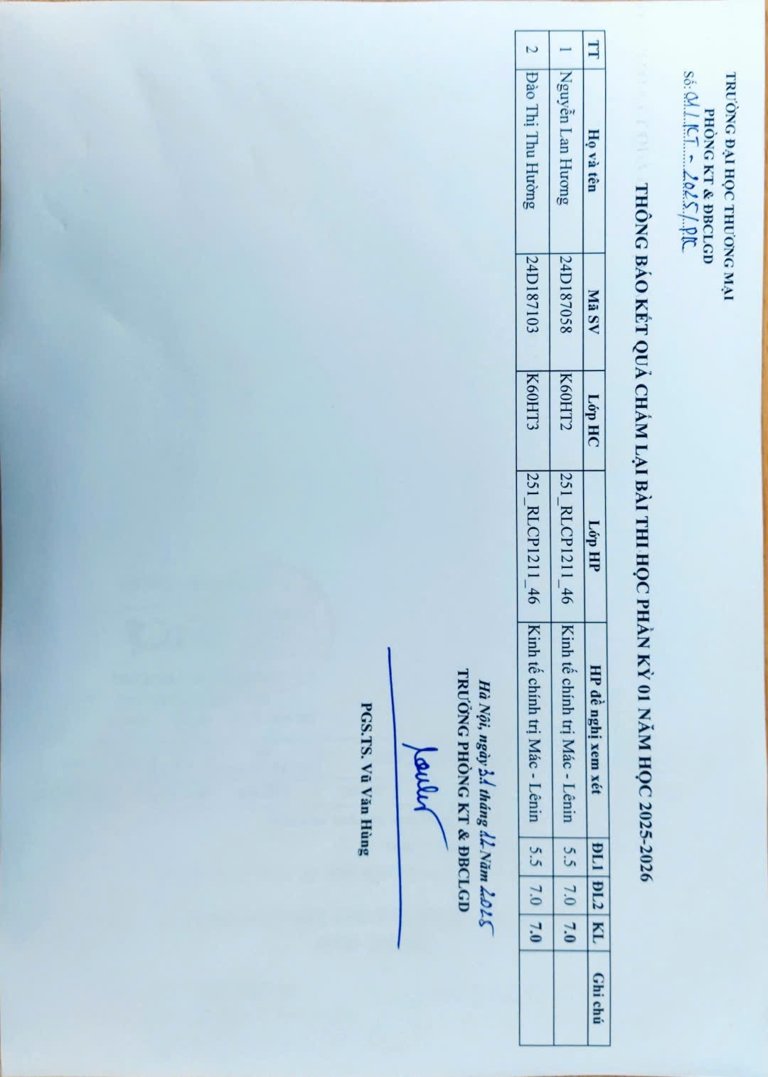 THÔNG BÁO KẾT QUẢ CHẤM LẠI BÀI THI HỌC PHẦN KỲ 01 NĂM HỌC 2025 - 2026 (TB số 01/KT)