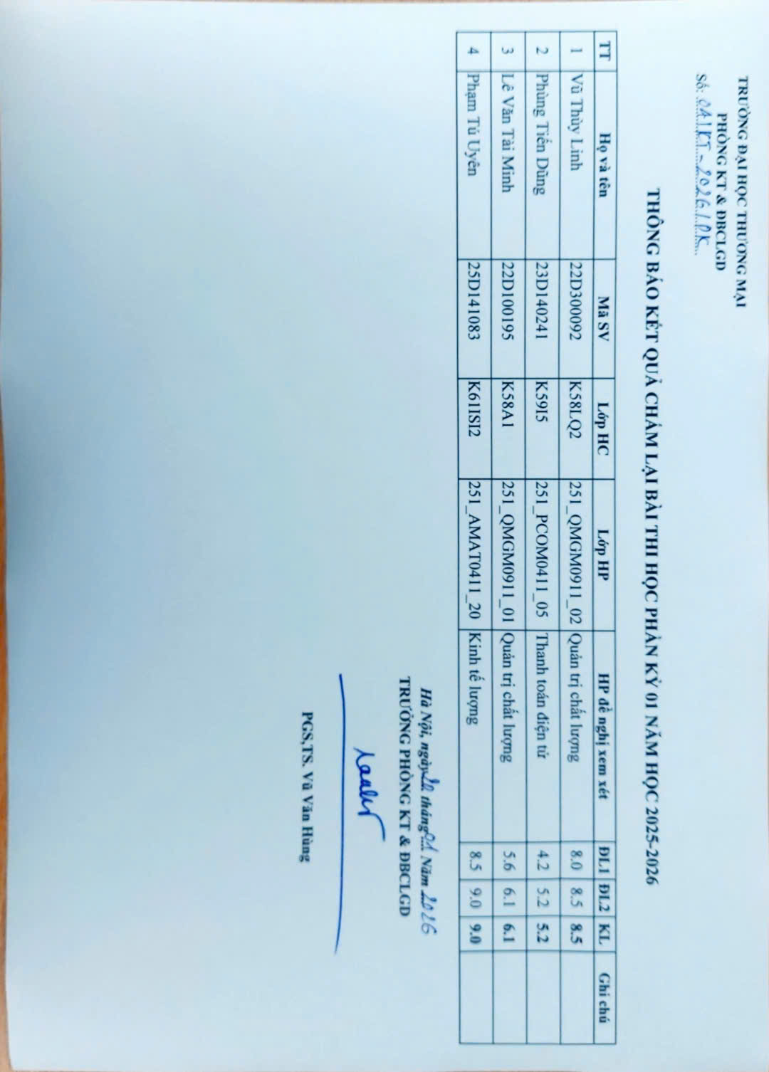 THÔNG BÁO KẾT QUẢ CHẤM LẠI BÀI THI HỌC PHẦN KỲ 01 NĂM HỌC 2025 - 2026 (TB số 04/KT-2026)