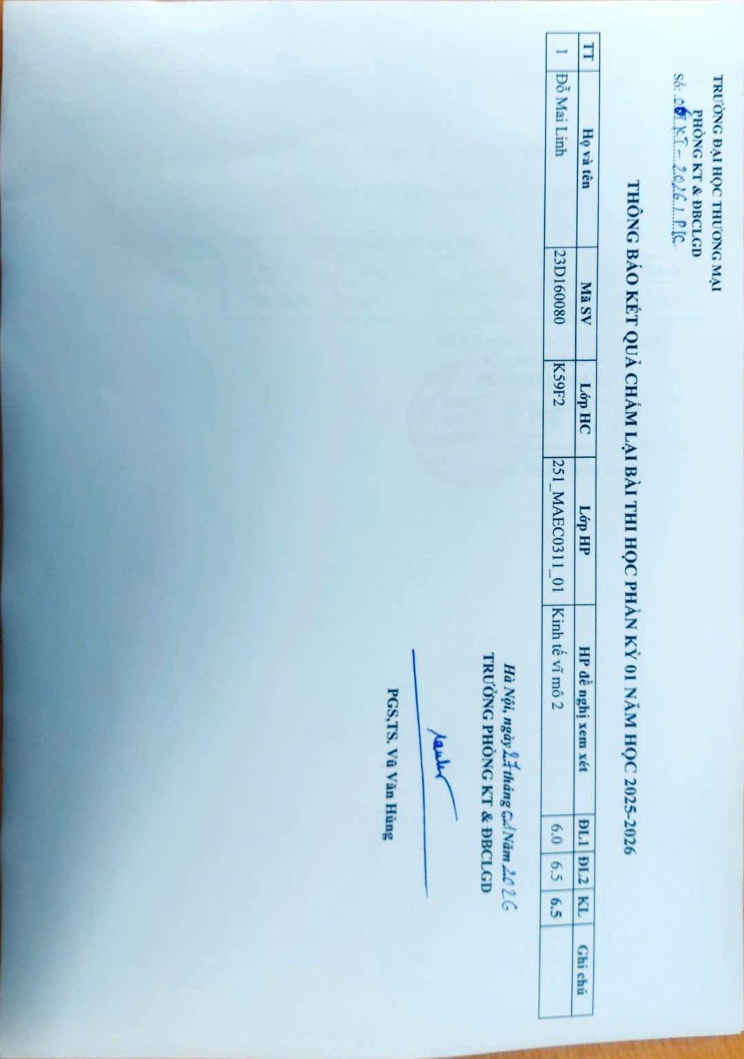 THÔNG BÁO KẾT QUẢ CHẤM LẠI BÀI THI HỌC PHẦN KỲ 01 NĂM HỌC 2025 - 2026 (TB số 06/KT)