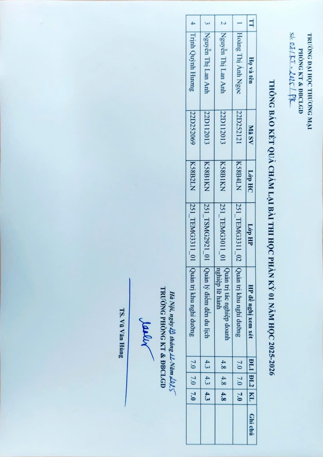 THÔNG BÁO KẾT QUẢ CHẤM LẠI BÀI THI HỌC PHẦN KỲ 01 NĂM HỌC 2025 - 2026 (TB số 07/KT)