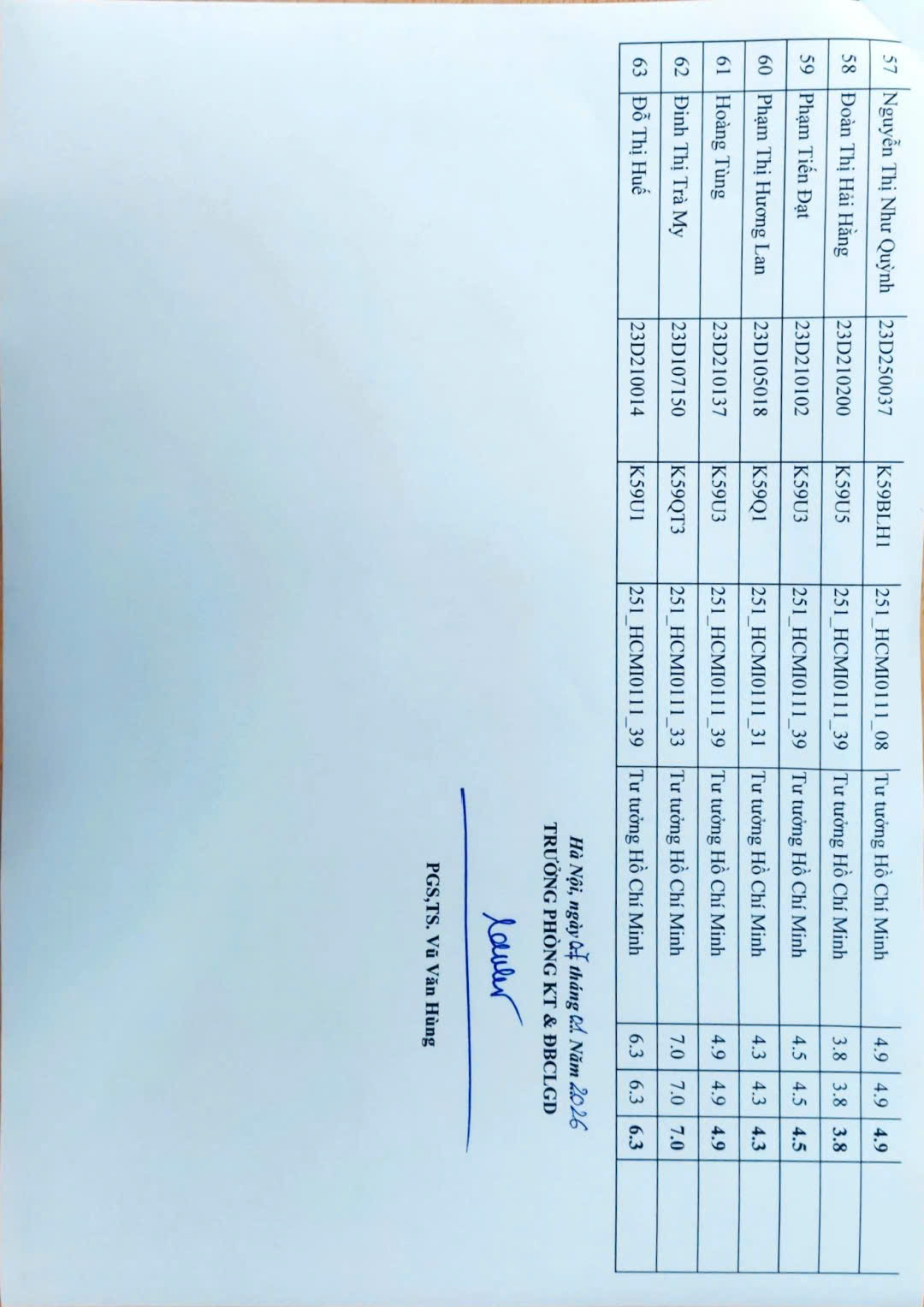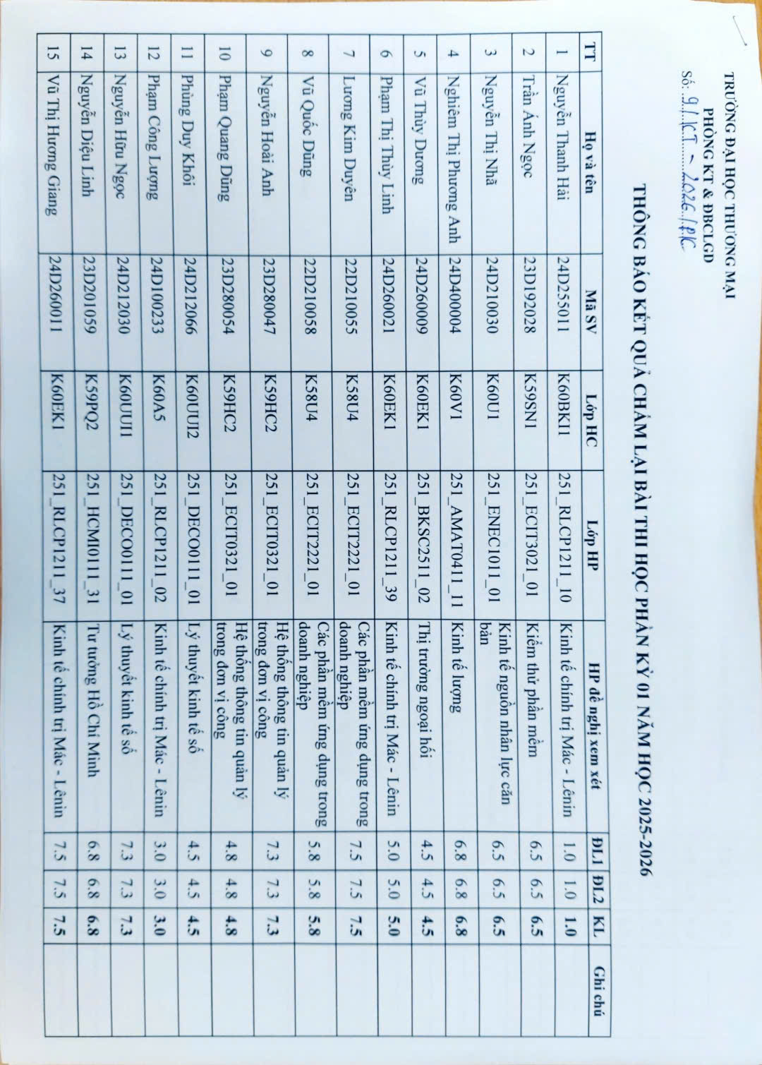 THÔNG BÁO KẾT QUẢ CHẤM LẠI BÀI THI HỌC PHẦN KỲ 01 NĂM HỌC 2025 - 2026 (TB số 09/KT)