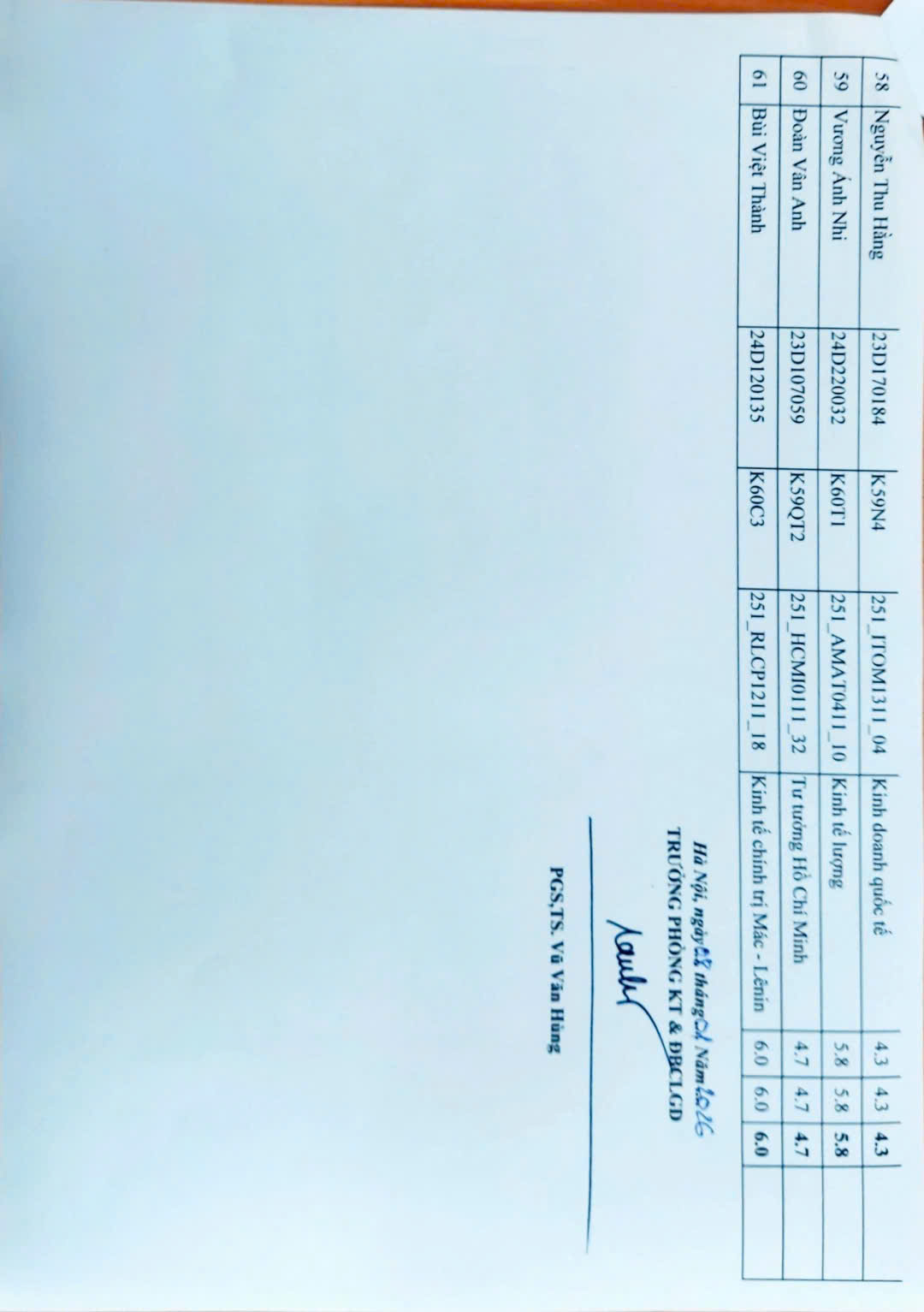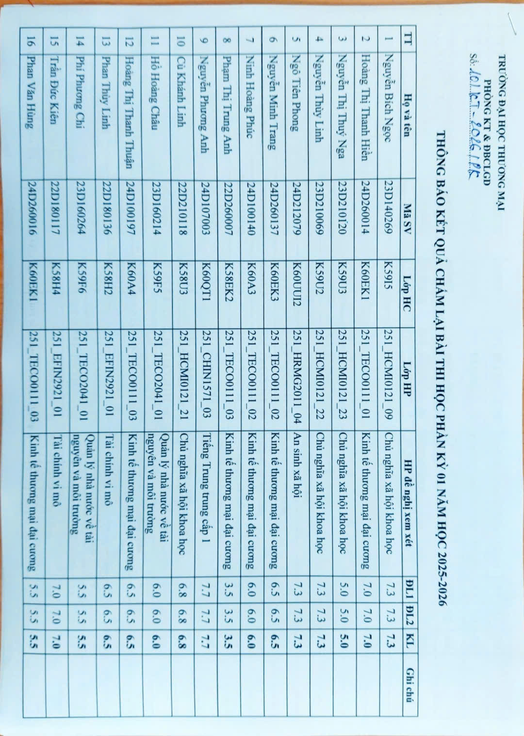 THÔNG BÁO KẾT QUẢ CHẤM LẠI BÀI THI HỌC PHẦN KỲ 01 NĂM HỌC 2025 - 2026 (TB số 10/KT)