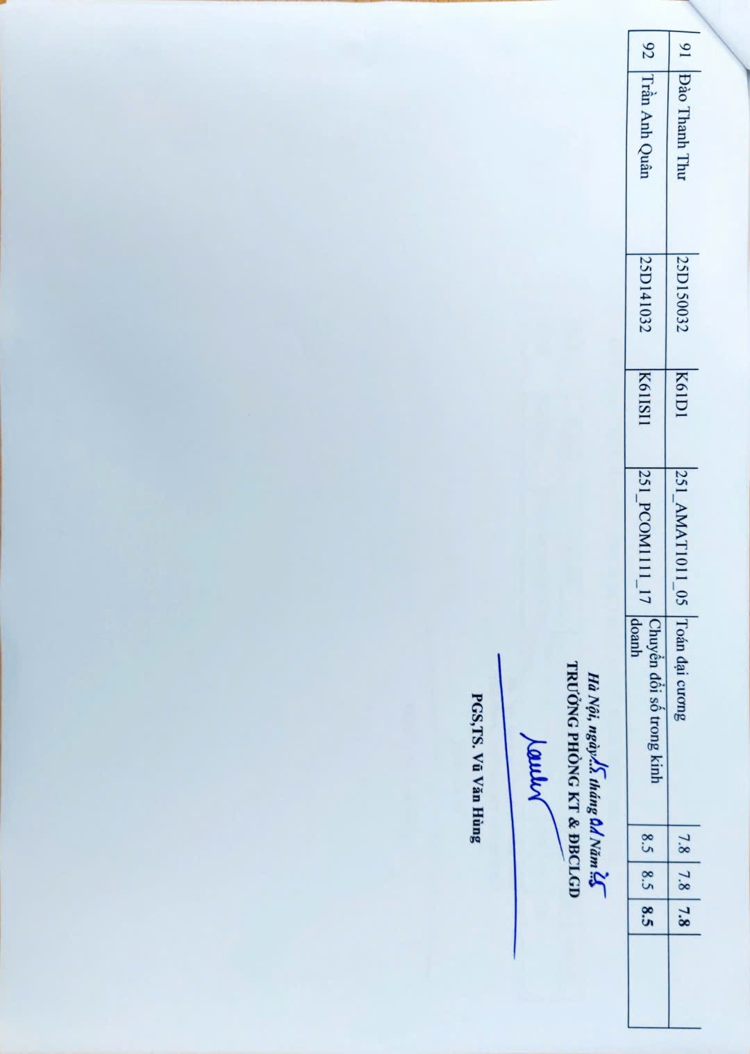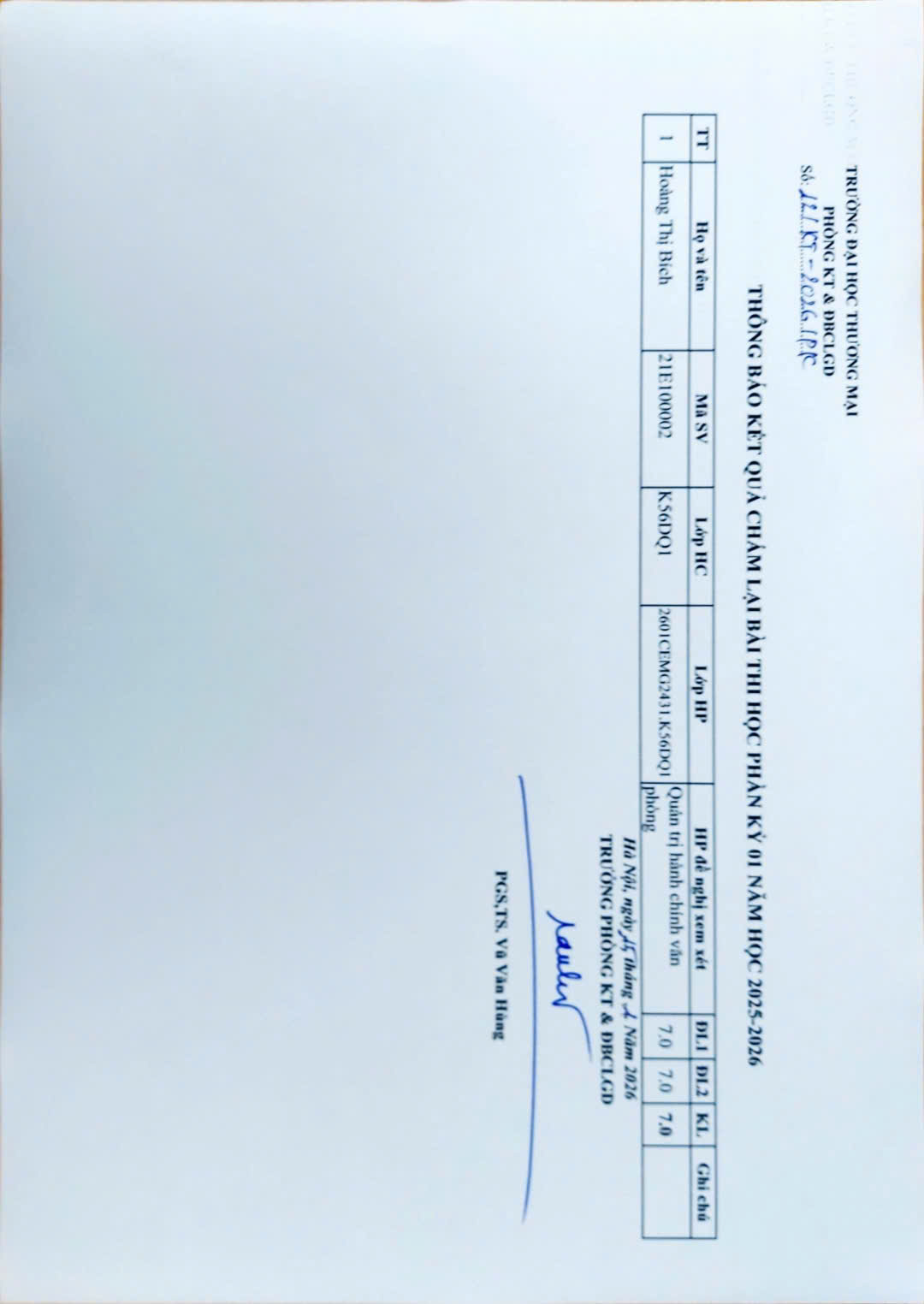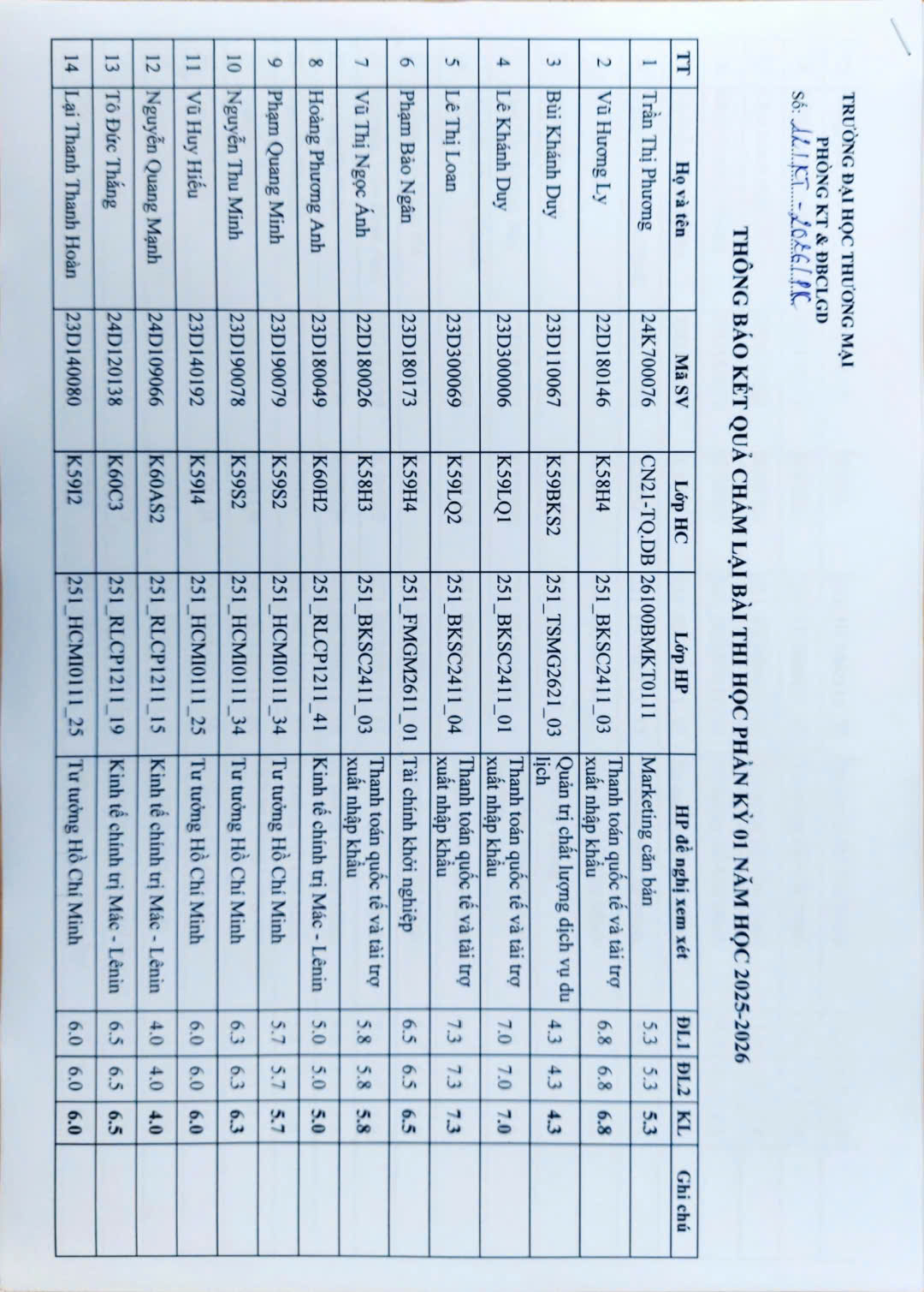 THÔNG BÁO KẾT QUẢ CHẤM LẠI BÀI THI HỌC PHẦN KỲ 01 NĂM HỌC 2025 - 2026 (TB số 12/KT)