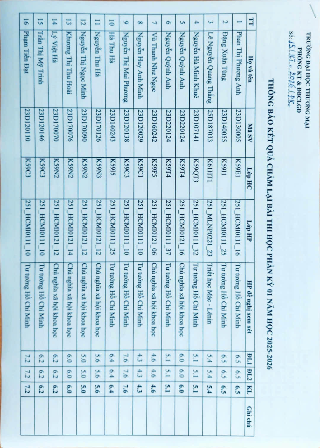 THÔNG BÁO KẾT QUẢ CHẤM LẠI BÀI THI HỌC PHẦN KỲ 01 NĂM HỌC 2025 - 2026 (TB số 15/KT)