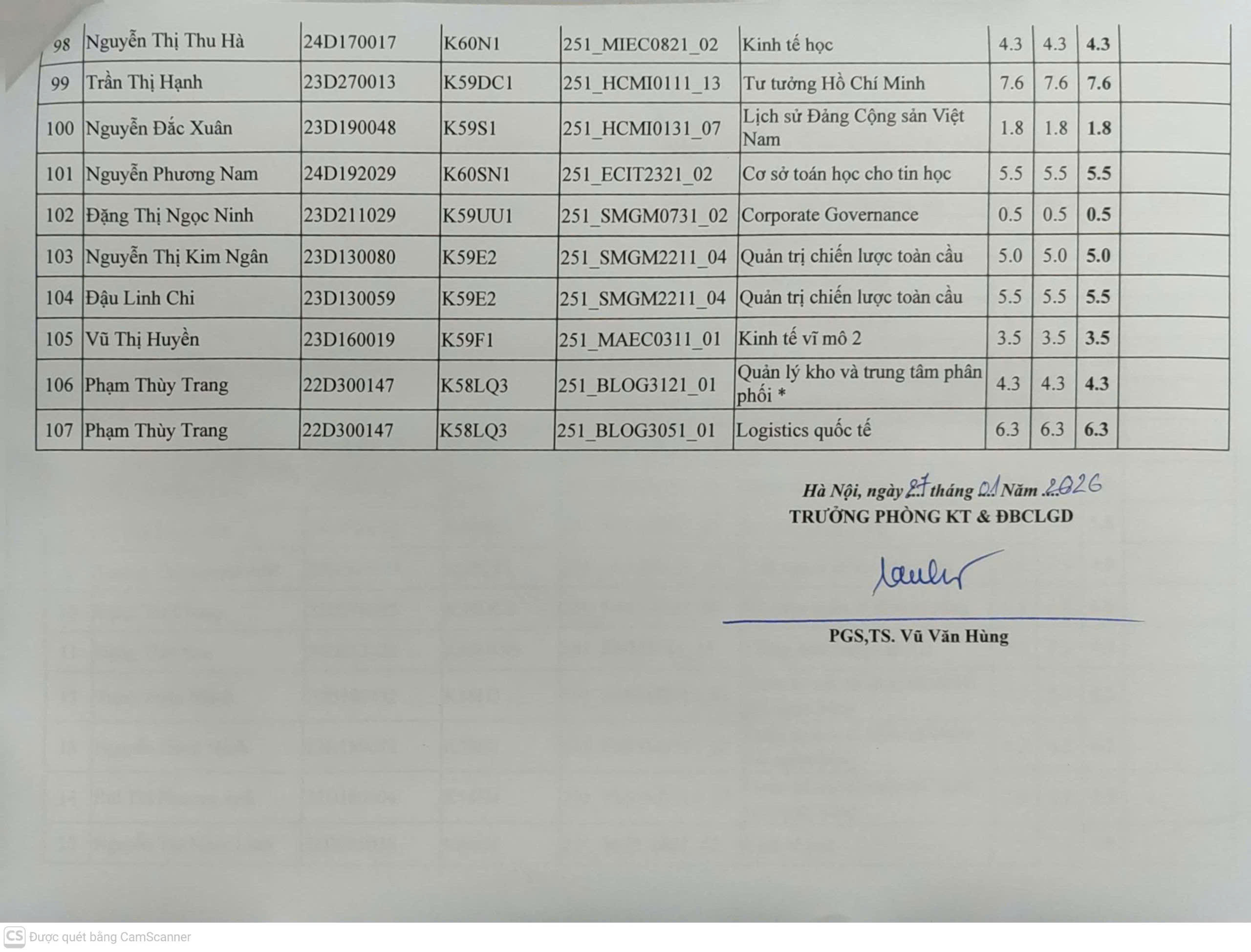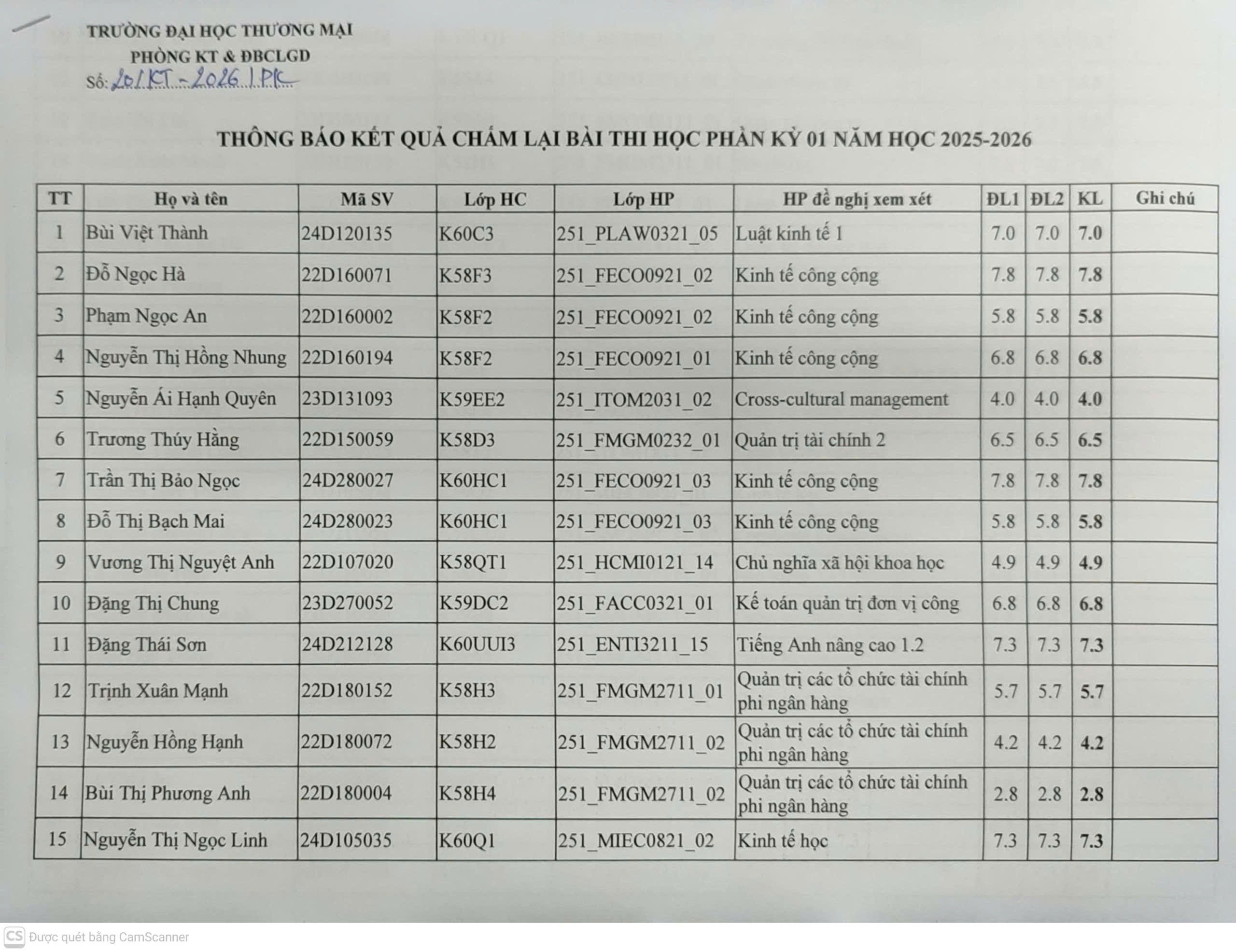 THÔNG BÁO KẾT QUẢ CHẤM LẠI BÀI THI HỌC PHẦN KỲ 01 NĂM HỌC 2025 - 2026 (TB số 20/KT)