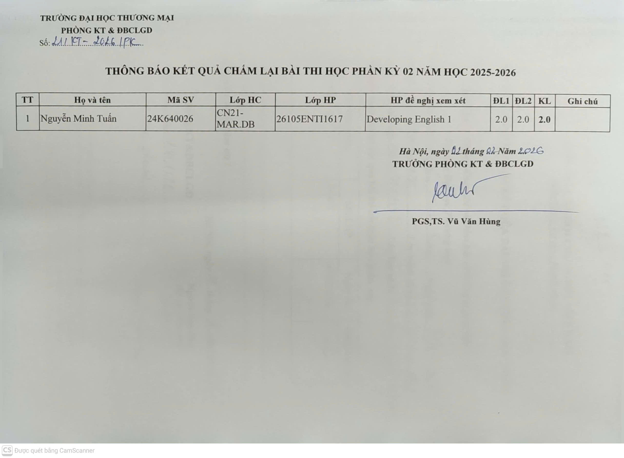 THÔNG BÁO KẾT QUẢ CHẤM LẠI BÀI THI HỌC PHẦN KỲ 01 NĂM HỌC 2025 - 2026 (TB số 21/KT)