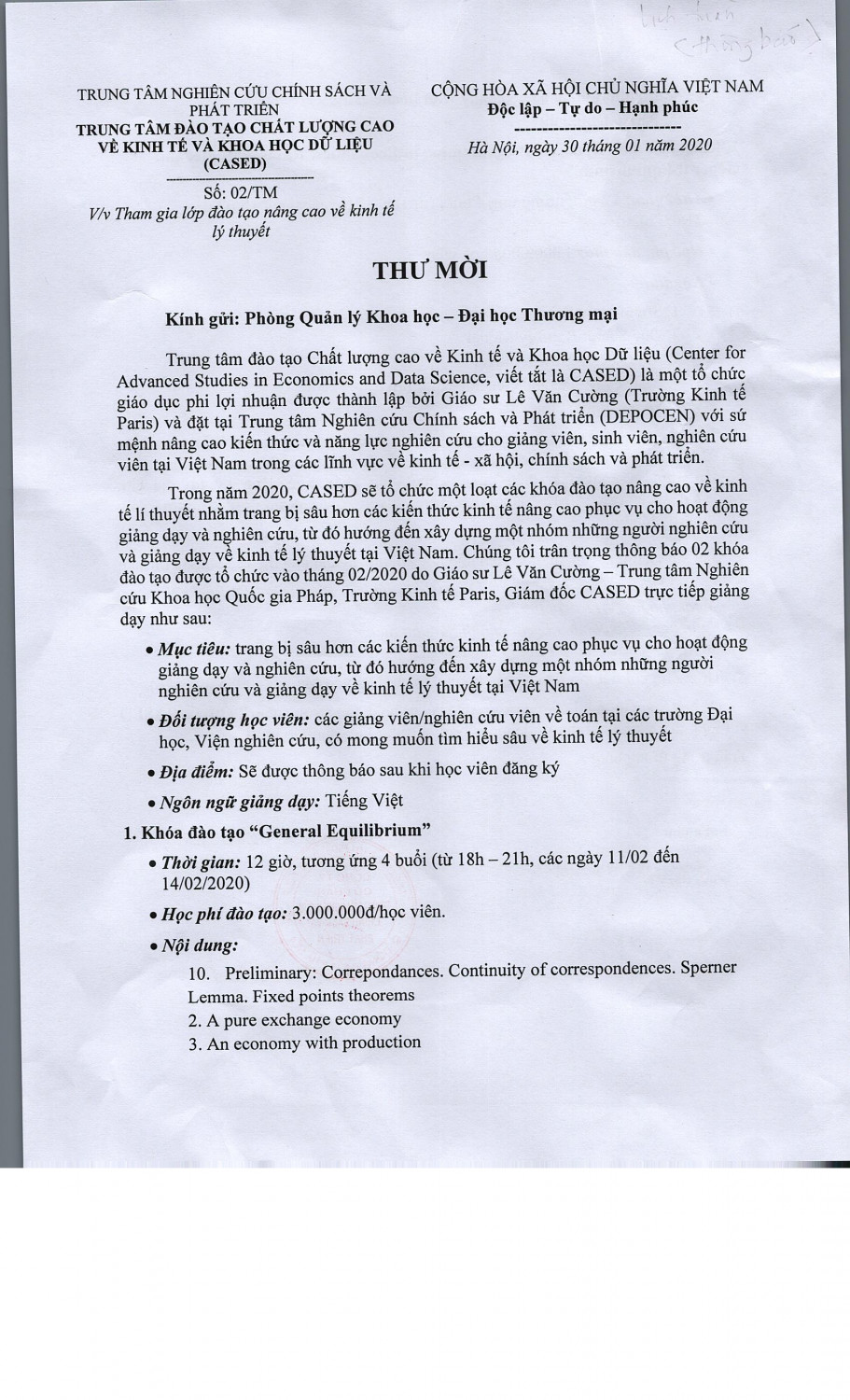 1. Thư mời tham gia lớp “đào tạo nâng cao về kinh tế lý thuyết” của Trung tâm đào tạo chất lượng cao về kinh tế và khoa học dữ liệu (CASED).